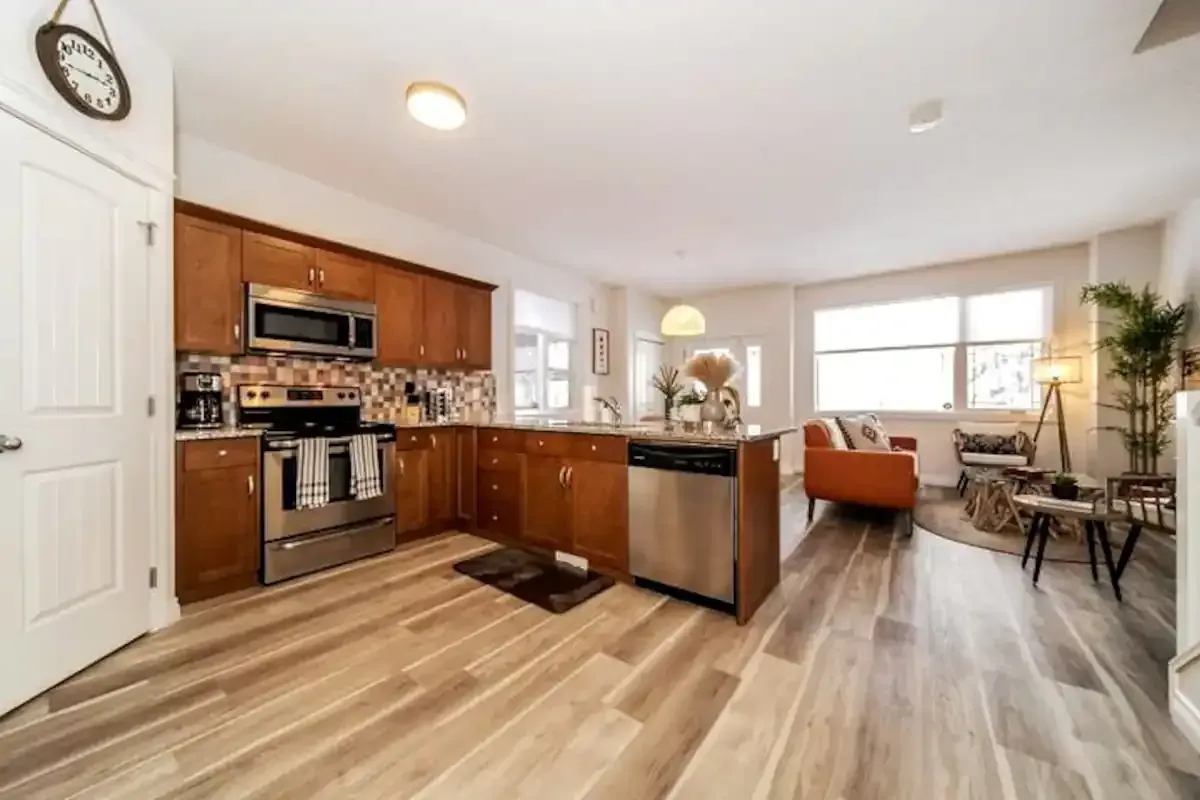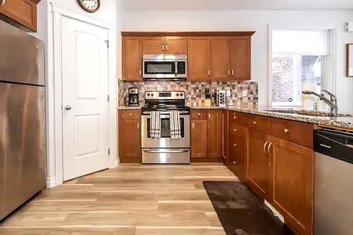 Complimentary Wi-Fi, Netflix, tea, and coffee. The kitchen comes fully loaded with all appliances such as a microwave, fridge, electric stove, and dishwasher along with glasses, mugs, dishes, and cutlery.